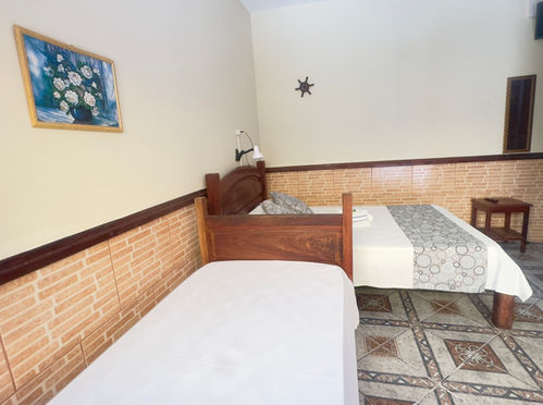 A Suíte Quádrupla Twin acomoda até 4 pessoas em uma cama de casal, uma cama de solteiro e uma cama auxiliar com banheiro privativo.